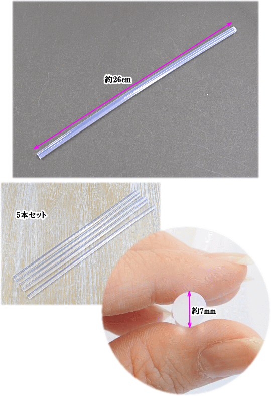 【商品詳細】■サイズ長さ:約26cm 直径:約7mm■個数5本セット■カラー透明■ゆうパケット10点まで可能■対応グルーガン・低温用、高温用どちらのグルーガンでもお使いいただけます。